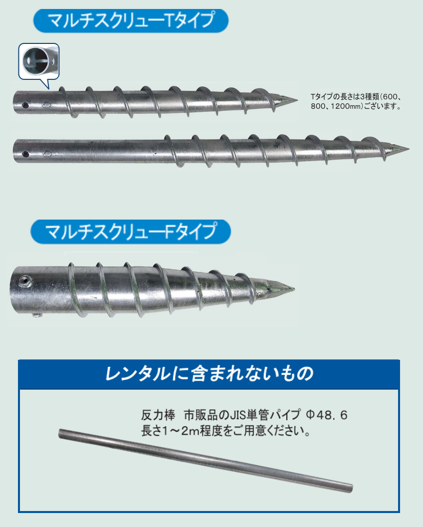 - 地盤の硬い場合には、施工に大きなトルクが必要になります。作業者が反力を支えることが容易でない場合は、反力棒の長さを長くしたり、 固定物で支えるなどして、安全に十分配慮してください。